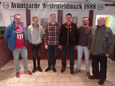 Zum Bierkönigschießen der Avantgarde konnte unser 1. Kommandeur, Michael Tegethoff, rund 45 Gäste aus dem Verein, der Avantgarde Norden 1925 und des 1. Zuges des Schützenbundes Westenheide am Haus Liedtke begrüßen. Gleich zu Beginn gab es eine Ehrung die es in der 135-jährigen Geschichte der Avantgarde Westenfeldmark so noch nicht gegeben hatte: